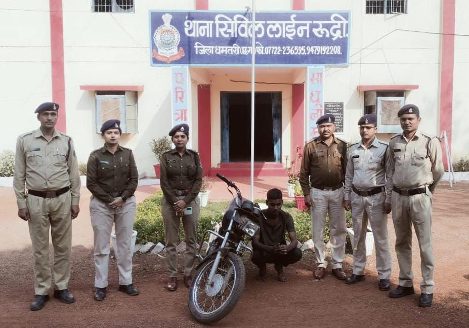 विवेचना दौरान मुखबीर सूचना पर आरोपी लुनकरण बंजारे पिता रोशन बंजारे उम्र 19 साल साकिन सोरम नालापारा थाना रूद्री जिला धमतरी का चोरी की मोटर सायकल को नम्बर प्लेट निकाल कर बिक्री करते रंगे हाथ पकडा गया।