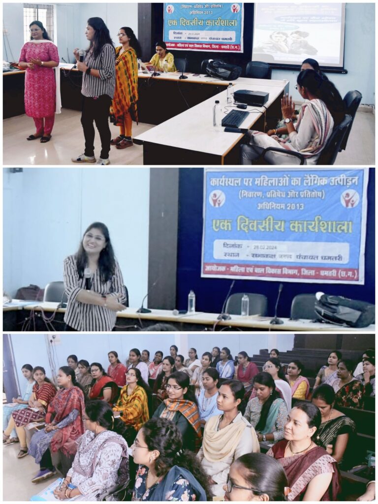 धमतरी (प्रखर) महिला एवं बाल विकास विभाग द्वारा आज जनपद पंचायत धमतरी के सभाकक्ष में महिलाओं का कार्यस्थल पर लैगिंक उत्पीड़न (निवारण, प्रतिषेध और प्रतितोष) अधिनियम 2013 विषय पर एक दिवसीय कार्यशाला का आयोजन किया गया। कार्यशाला में अधिनियम के अंतर्गत गठित स्थानीय परिवाद समिति के सदस्यों तथा जिला स्तर के 25 कार्यालयों में गठित आंतरिक शिकायत समिति के 2 सदस्य प्रतिभागी के रूप में सम्मिलित हुए।