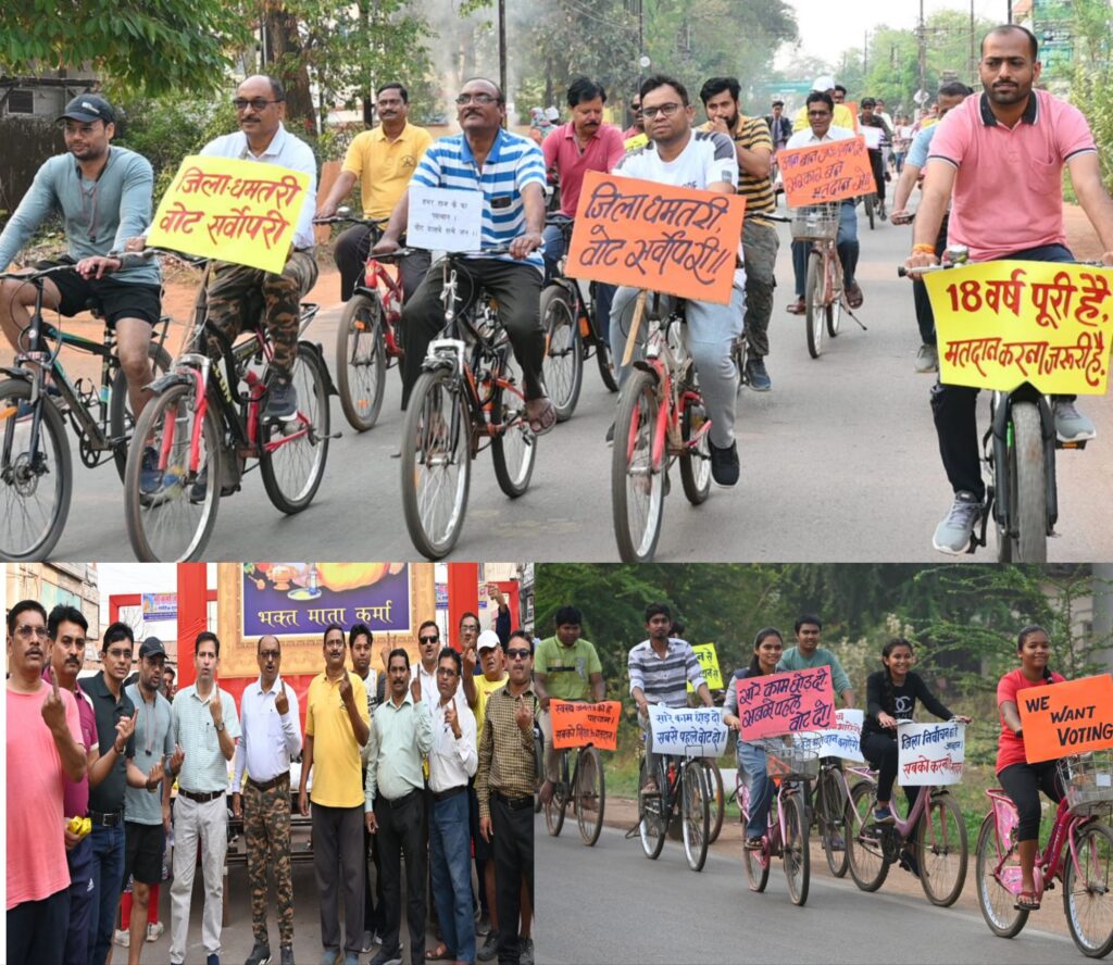 कलेक्टर एवं जिला निर्वाचन अधिकारी सुश्री नम्रता गांधी ने कहा कि सायकल रैली का उद्देश्य मतदाता जागरूकता का संदेश जन-जन तक पहुंचाकर मतदाताओं को उनके मताधिकार के प्रति जागरूक करना है। उन्होंने कहा कि जिले में मतदान प्रतिशत को बढ़ाने विभिन्न प्रकार की मतदाता जागरूकता गतिविधियों का आयोजन लगातार किया जा रहा है। इन्हीं कार्यक्रमों के तहत आज स्वीप सायकल रैली का आयोजन किया गया। आगामी 26 अप्रैल को होने वाले निर्वाचन में जिलेवासियों से अपील करते हुए कलेक्टर ने कहा कि वे अपने मताधिकार का प्रयोग अनिवार्य रूप से करें। वहीं जिला पंचायत की मुख्य कार्यपालन अधिकारी एवं स्वीप जिला नोडल अधिकारी सुश्री रोमा श्रीवास्तव ने कहा कि बीते विधानसभा में धमतरी जिला सर्वाधिक मतदान करने वाला जिला बना है। इस परम्परा को आगे बढ़ाते हुए इस बार भी हम अपने घरों से निकले और अपने मताधिकार का प्रयोग करें। सायकल रैली में जिला शिक्षा अधिकारी शटीआर जगदल्ले, सहायक संचालक शिक्षा लक्ष्मण राव मगर, मुख्य कार्यपालन अधिकारी जनपद पंचायत धमतरी दीपक ठाकुर, सहायक नोडल अधिकारी स्वीप डॉ.शैलेन्द्र गुप्ता सहित अन्य अधिकारी-कर्मचारी एवं महाविद्यालयीन छात्र-छात्राएं उपस्थित थे।