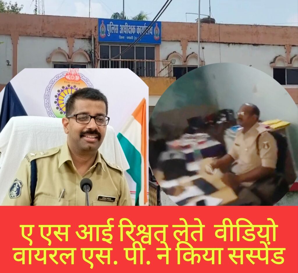 धमतरी (प्रखर) प्रार्थी अमन ध्रुव द्वारा थाना कोतवाली के एसएसआई.के रिश्वत लेने के मामले मे प्राप्त शिकायत एवं रिकार्डिंग विडियो को तत्काल संज्ञान में लेते हुए पुलिस अधीक्षक आंजनेय वार्ष्णेय ने एएसआई.रमेश साहू को तत्काल निलंबित किया गया।