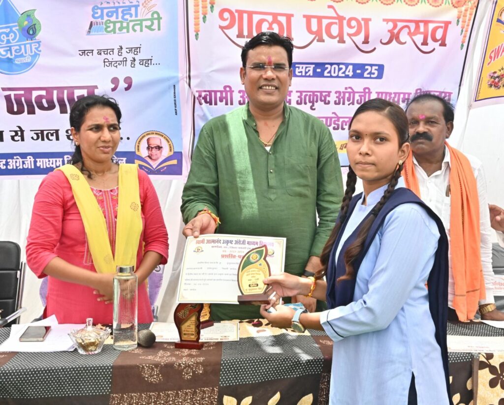 धमतरी जिले में आज शाला प्रवेशोत्सव का आयोजन किया गया। बच्चे मुस्कुराते, खिलाखिलाते हुए स्कूल पहुंचे और मौके पर उपस्थित गुरूजनों, गणमान्य नागरिकों सहित जनप्रतिनिधियों ने बच्चों का तिलक लगाकर, मिठाई खिलाकर स्वागत किया। धमतरी विकासखण्ड के कण्डेल स्थित स्वामी आत्मानंद अंग्रेजी माध्यम उत्कृष्ट विद्यालय में आयोजित कार्यक्रम में कलेक्टर सुश्री नम्रता गांधी, विधायक धमतरी श्री ओंकार साहू सहित अतिथियों ने मां सरस्वती के छायाचित्र की पूजा अर्चना की और विद्यार्थियों द्वारा कार्यक्रम प्रस्तुत किया गया। इस अवसर पर जल जगार उत्सव संबंधी कार्यक्रम भी प्रस्तुत किया गया। कण्डेल में आयोजित कार्यक्रम में विधायक साहू ने वृक्षारोपण भी किया।