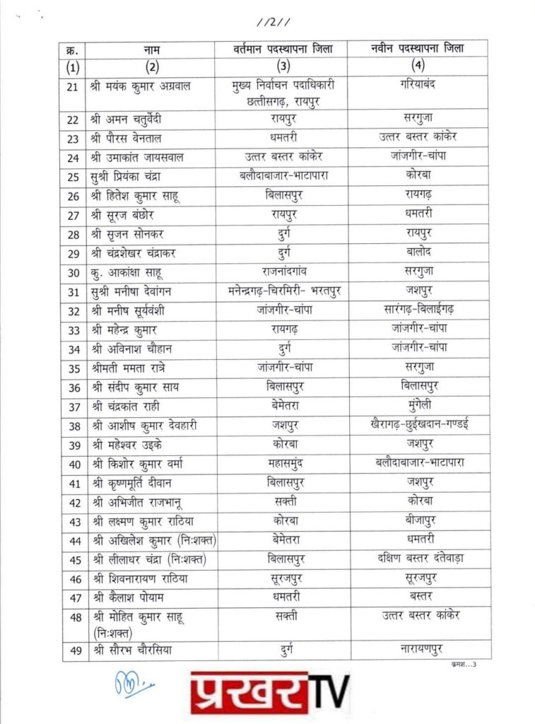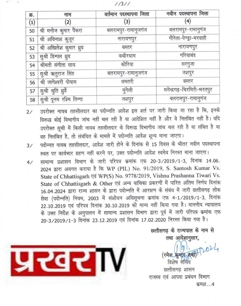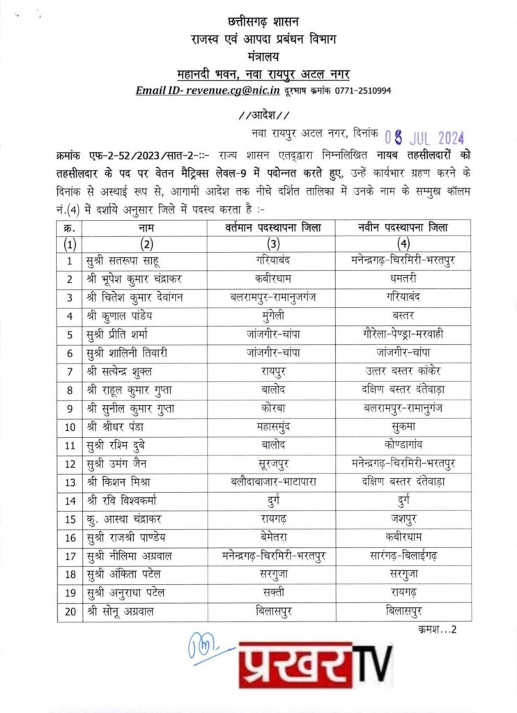 धमतरी (प्रखर) राज्य शासन द्वारा 58 नायब तहसीलदारों को तहसीलदार के पद पर प्रमोशन किया गया है और राज्य के अलग-अलग जिलों में पदस्थापना किया गया है भूपेश कुमार चंद्राकर कबीरधाम से धमतरी, सूरज बंछोर रायपुर से धमतरी, अखिलेश कुमार सिन्हा ( निशक्त ) बेमेतरा से धमतरी इनका नवीन पदस्थापना जिला धमतरी हुआ है