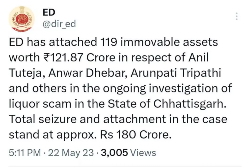 रायपुर (प्रखर) । प्रदेश में दो हजार करोड़ रुपए के कथित शराब घोटाले की जांच कर रही ईडी ने इंडियन टेलीकॉम सर्विस के अफसर और आबकारी विभाग के स्पेशल सेक्रेटरी अरुण पति त्रिपाठी और कारोबारी अनवर ढेबर सहित अन्य की 121.87 करोड़ की संपत्ति अटैच कर ली है। इस मामले में अब तक 180 करोड़ की संपत्ति अटैच की जा चुकी है।