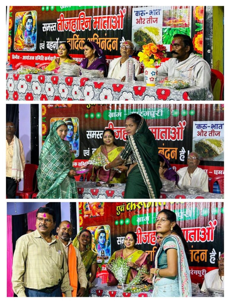 धमतरी (प्रखर) ग्राम विकास समिति सारंग पूरी द्वारा हरितालिका व्रत ( तीजा )की पूर्व संध्या पर ग्राम में आए हुए बहन बेटियों के सम्मान में समारोह एवं करूँ भात खिलाने कार्यक्रम का आयोजन किया गया जिसमें क्षेत्र की जिला पंचायत सदस्य श्रीमती कविता योगेश बाबर को अतिथि के रूप में आमंत्रित किया गया श्रीमती बाबर ने भगवान शंकर एवं पार्वती की पूजा अर्चना कर कार्यक्रम में शामिल हुई ग्राम में तीजा आए हुए बहन एवं बेटियों को साड़ी श्रीफल एवं करुभात खिलाकर उनका सम्मान किया गया तीजा का त्योहार हमारे हिंदू धर्म एवं संस्कृति में पारंपरिक त्योहार है जो प्रति वर्ष भाद्र मास में मनाया जाता है इसमें महिलाएँ अपने पति की दीर्घ आयु के लिए एवं कुंवारी कन्याएं सुयोग्य वर की प्राप्ति के लिए इस व्रत का पालन करती है इस अवसर पर श्रीमती बाबर ने सभा को संबोधित करते हुए कहा कि आप सभी को तीजा पर्व की बहुत बहुत हार्दिक बधाई एवं शुभकामनाएं देती हूँ एवं इस व्रत के करने से भगवान शिव एवं पार्वती ख़ुश होकर आप सभी की मनोकामनाएं पूर्ण करें उन्होंने उपस्थित जन समुदाय को बताया कि पूर्व मुख्यमंत्री भूपेश बघेल छत्तीस गढ़िया मुख्यमंत्री ने अपने कार्यकाल में तीज त्योहारों को विशेष रूप से मनाने की परंपरा की शुरुआत की थी जिसका सार्थक परिणाम आज देखने को मिल रहा है यह पर्व भगवान शिव व माता पार्वती के मिलन का प्रतीक है भगवान शिव को पाने के लिए माँ पार्वती ने इस कठोर व्रत का पालन किया था तब उन्हें भगवान शिव उन्हें प्राप्त हुवे थे इस कार्यक्रम में श्रीमति बाबर ने भोजन करने आए हुए समस्त माताओं एवं बहनों को खाना परोस कर उनका अभिवादन किया कार्यक्रम के इस अवसर पर आयोजन समिति के लतेल साहू भोला दीवान रामकुमार यादव जोहत राम नेताम खोवा राम साहू गंगा राम साहू गोपेश यादव थानसिंग दीवान देवेंद्र निषाद लता साहू रीतिका यादव नंद कुमारी साहू दीप माला साहू उप सरपंच हनीफ़ ख़ान धनु जांगड़े कैलाश साहू प्रीतम सोनकर व बड़ी संख्या में ग्रामवासी उपस्थित थे