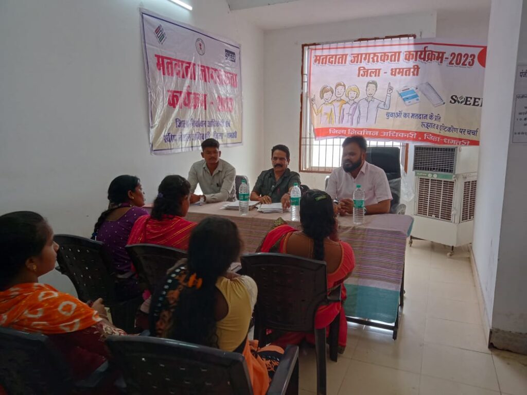 धमतरी — जिला रोजगार कार्यालय धमतरी में 26 जून को प्लेसमेंट कैंप का आयोजन किया गया । जिसमें इस वर्ष विधानसभा चुनाव के मद्देनजर मतदाता जागरूकता अभियान चलाया गया। सभी युवाओं को मतदाता परिचय पत्र बनवाने एवम शत प्रतिशत मतदान करने हेतु अपील किया गया।