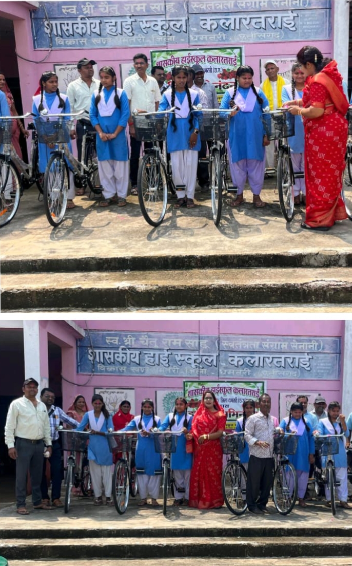 धमतरी (प्रखर) शासकीय हाई स्कूल कलारताई में निशुल्क सरस्वती साइकिल योजना के अंतर्गत बालिकाओं को साइकिल प्रदान किया गया मुख्य अतिथि जिला पंचायत सभापति श्रीमती मोनिका देवांगन ने इस अवसर पर कहा कि नि:शुल्क सरस्वती साइकिल योजना बालिकाओं के लिए सरकार की महत्वाकांक्षी योजना है इसके लिए हम प्रदेश के मुखिया विष्णु देव साय को बहुत धन्यवाद देते हैं। साइकिल आवागमन का सुलभ संसाधन है हमारी बेटियों को दूर स्कूल में पढ़ने जाने के लिए सुविधा होगी ।बिना किसी परेशानी की हमारी बेटियां अपनी पढ़ाई को निरंतर जारी रख सकती हैं।।