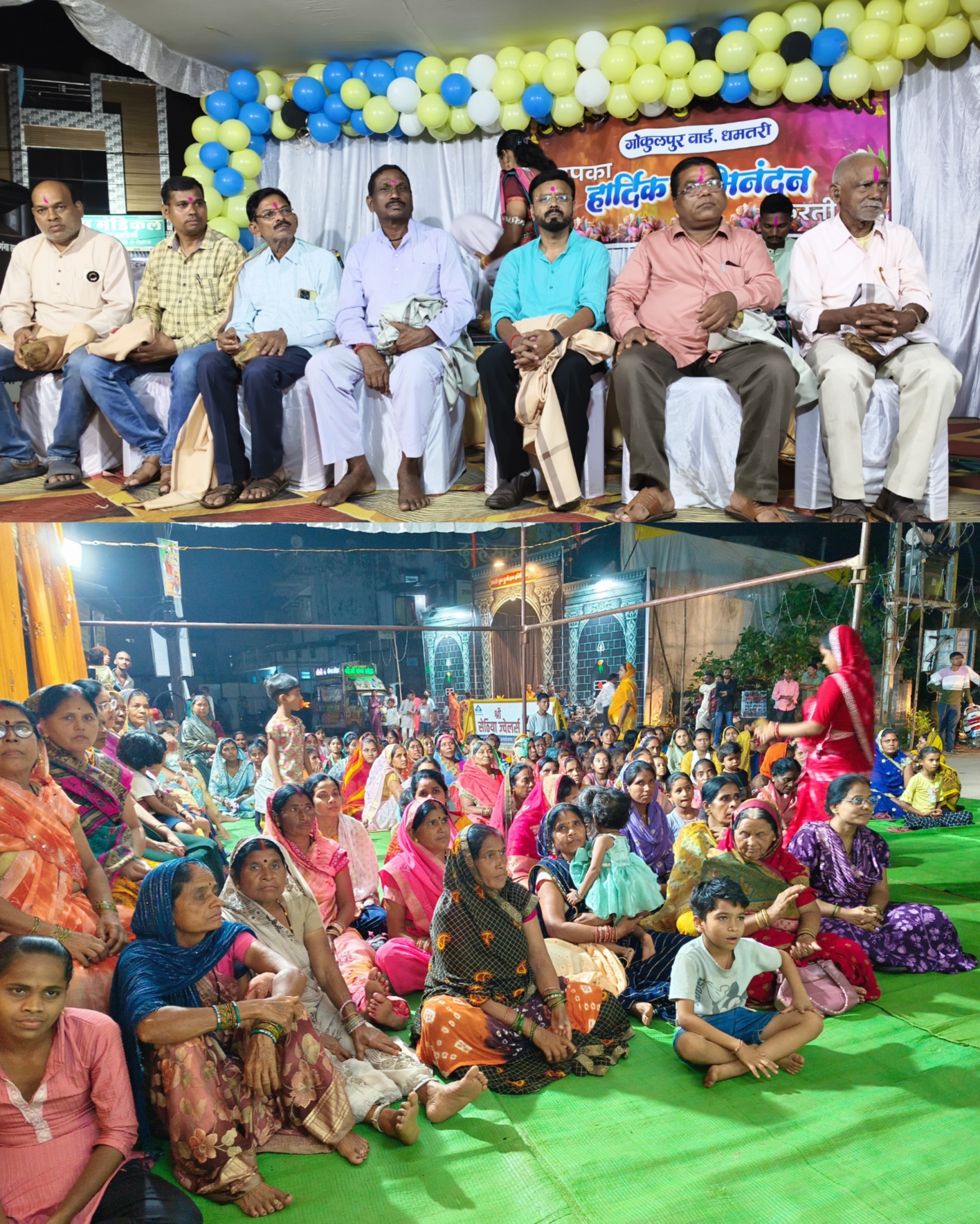 धमतरी -नगर के गोकुलपुर वार्ड में चैत्र नवरात्रि की पावन अवसर पर सांस्कृतिक कार्यक्रम का आयोजन हुआ. आदर्श युवा दुर्गा उत्सव समिति लक्ष्मी निवास चौक के तत्वाधान में आयोजित कार्यक्रम मे खम्हरिया नगरी के आकाशवाणी दूरदर्शन कलाकार महाभारत कथा पंडवानी गायिका खेमिन यादव ने जय गुरुदेव पंडवानी पार्टी के सदस्यों के साथ शानदार प्रस्तुति प्रदान की. कार्यक्रम शुभारंभ से पूर्व समिति के सदस्यों द्वारा अतिथियों का स्वागत अभिनंदन किया गया जिसमे अथिति के रूप मे मुख्य रूप से डॉ. आशीष नायक राज्यपाल पुरस्कार प्राप्त शिक्षक, गजेंद्र कंवर वार्ड पार्षद, भगवान सिंह यादव अध्यक्ष मोहल्ला विकास समिति गोकुलपुर, महेश साहू पूर्व पार्षद, निखिलेश देवान समाजसेवी, डॉ. भूपेन्द्र साहू वरिष्ठ पत्रकार धमतरी, यशवंत साहू अधिवक्ता एवं समाजसेवी, रामाधार साहू सेवानिवृत शिक्षक, राजा देवांगन एनएसयूआई जिला अध्यक्ष उपस्थित रहे। पंडवानी गायिका खेमिन यादव के द्वारा महाभारत के विभिन्न पात्रों का वर्णन करने के साथ-साथ समाज में नारी का योगदान, नशा मुक्ति, परिवार का महत्व जैसे संदेशों का प्रसार किया गया। इस दौरान पंडा मुकेश यादव, समिति के सदस्य रामखिलावन साहू, नरेंद्र साहू, मोहन साहू, ओम प्रकाश साहू, पुरुषोत्तम यदु, विजय यादव, यादवेन्द्र यदु, दीपक यदु, हेमंत साहू, हिरेन्द्र यादव, उत्तम साहू, मोहिनी साहू, एकता ठाकुर, हुमेन्द्र साहू, बसंत साहू, अरविन्द यदु, ओम साहू, मनेश साहू, शिवेन्द्र साहू, विरेन्द्र साहू, विवेक साहू, ईश साहू, महेश साहू, राजकुमार साहू, प्रदीप यादव, योगेश साहू, त्रिलोक साहू, शेषनारायण यादव, हिमेश साहू, पुष्पक साहू, सुमित भेसले, राम अवतार साहू, टेमन साहू, त्रिवेणी यादव, झयान्स सेन, उदय साहू, हेवन्त यादव, बिट्टू साहू, प्रवीण सेन, नागेश निषाद, आकाश साहू सहित बड़ी संख्या में वार्डवासी उपस्थित रहे।