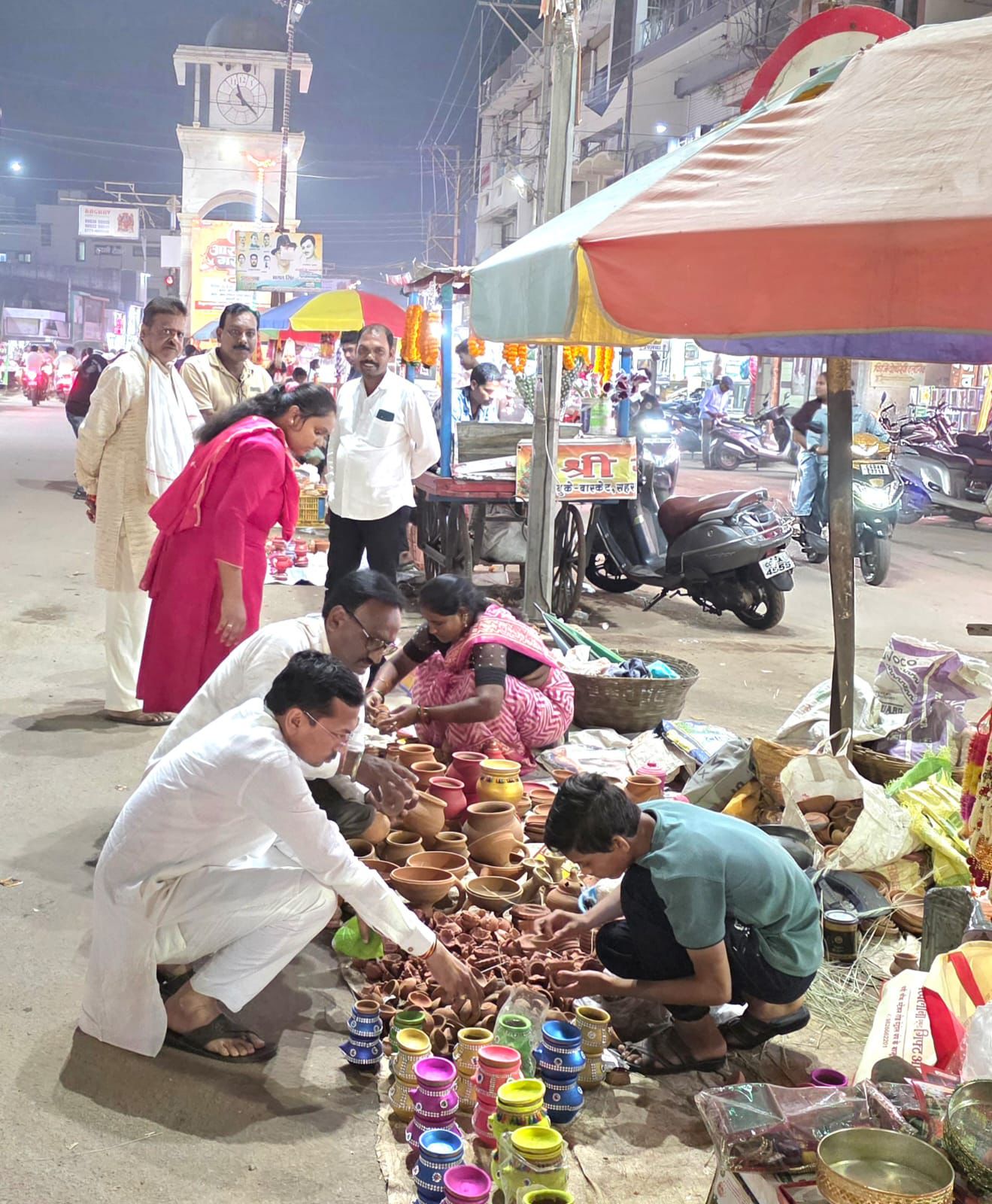 धमतरी-भाजपा प्रदेश सह कार्यालय मंत्री प्रीतेश गांधी द्वारा दीपावली के पावन अवसर पर स्थानीय पारंपरिक वस्तुओं का निर्माण करने वाले कुम्हार बंधुओ से मिट्टी के दिए सहित विभिन्न सामग्रियों की खरीदी करने के लिए बाजार में अपने सहयोगी जनप्रतिनिधियों नगर निगम के पूर्व सभापति राजेंद्र शर्मा, एमआईसी सदस्य पिंटू यादव,कुलेश सोनी, महेंद्र खंडेलवाल के साथ पहुंचे तथा उन्हें प्रोत्साहित करते हुए प्रधानमंत्री नरेंद्र मोदी द्वारा वोकल फॉर लोकल की पवित्र भावनाओं को स्वयं में आत्मसात करते हुए देशवासियों को स्वदेशी वस्तुओं के बिक्री किए जाने के अभियान की शुरुआत बीते दिनों की है इसे ही आगे बढ़ाते हुए भाजपा प्रदेश सह कार्यालय मंत्री प्रीतेश गांधी ने आज आम जनमानस से दीपावली के पावन अवसर पर स्वदेशी वस्तुओं को अपने दैनिक जीवन के प्रत्येक क्रियाकलापों में उपयोग में लाने का आह्वान करते हुए कहा कि जिन लोगों के कारण हमारे जीवन में खुशियां आती है और अंधकार से मुक्त करते हुए प्रकाश का पर्व दीपावली में खुशियों का समावेश होता है ऐसे लोगों के चेहरों पर मुस्कान तथा घर परिवार में खुशी लाने के लिए उनके हाथों से बनी हुई वस्तुओं को खरीद कर आर्थिक रूप से उन्हें सुदृढ़ करते हुए उनके जीविकोपार्जन का माध्यम बने यही वर्तमान समय की आत्मनिर्भर भारत की परिकल्पना को साकार करते हुए विकसित भारत 2047 का सशक्त आधार स्तंभ में हमारा बहुत बड़ा योगदान होगा।