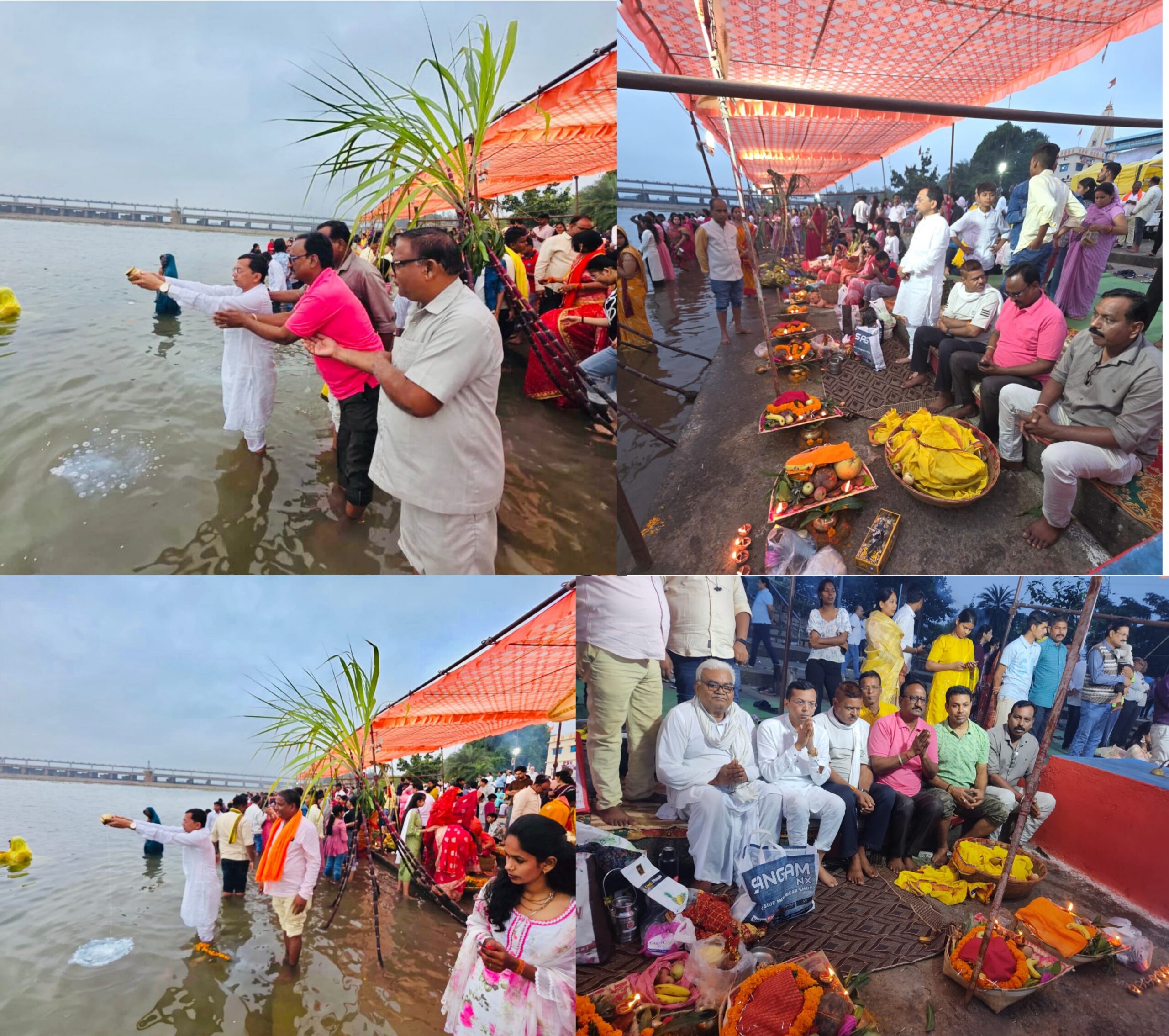 धमतरी(प्रखर)जीवनदायिनी मां गंगा के रूप में पवित्र जल में खडें होकर जब आकाश की ओर सूर्योदय की प्रतीक्षा की जा रही थी तब मोथा समुद्री तूफान के प्रभाव के कारण बादल में ढके हुए सूर्य देव आखिर में भक्तों की आस्था, श्रद्धा एवं विश्वास के आगे दर्शन देने के लिए अन्तत:प्रकट हुए तो पूरा वातावरण छठी मैया की जय, सूर्य भगवान की जय जयकारे से गूंज उठा। इस अवसर पर भगवान सूर्य देव की ओर निहारते हुए मानव जीवन की ऊर्जा का शाश्वत प्रतीक सूर्य देव के प्रति आस्था एवं श्रद्धा का समर्पण करते हुए प्रकृति जो हमारे जीवन का सर्वाधिक महत्वपूर्ण आधार स्तंभ है की पूजा अर्चना करते हुए सूर्य देव की महा आरती उतारकर  छठ पर्व के पवित्र उद्देश्य को फलीभूत करने उपस्थितजनों की भक्ति भावना देखते बन रही थी। इसी भाव को लेकर रुद्रेश्वर महादेव के घाट पर चार दिवसीय छठ महापर्व का अनुष्ठान भक्ति भाव के साथ संपन्न उगते सूर्य को अर्ध्य देकर करते हुए सभी ने एक दूसरे को इस महापर्व की शुभकामनाएं दी। इस अवसर पर भारतीय जनता पार्टी छत्तीसगढ़ प्रदेश सह कार्यालय मंत्री तथा सर्व गुजराती समाज के प्रदेश अध्यक्ष प्रीतेश गांधी द्वारा छठी मैया के प्रति भक्ति और निष्ठा समर्पित करते हुए सभी को शुभकामनाएं देकर कहा कि छठ का महापर्व समाज में आपसी, प्रेम, एकता, भाईचारे को बढ़ावा देते हुए सनातन धर्म को एकता के सूत्र में बांधने का एक सशक्त एवं सार्थक माध्यम के रूप से धार्मिक अनुष्ठान को संपन्न करने का सार्थक संदेश देता है, इस लोक पर्व में प्रकृति के लिए हमारा समर्पण जो की निस्वार्थ रूप से हमें पांच तत्व धरती, आकाश, पृथ्वी, वायु और जल के रूप में हमारे दिनचर्या में समाहित होकर जीवन जीने के लिए प्राण के रूप में संजीवनी देती है श्री गांधी ने आगे कहा कि हमारे जीवन में वर्ष में एक बार यह छठ का महापर्व हमें हमेशा यह याद दिलाता है कि उक्त सारे प्राकृतिक संसाधनों के प्रति हमें हमेशा कृतज्ञता ज्ञापित करते हुए जीवन पर्यंत ऋणी रहना चाहिए। उक्त अवसर पर नगर निगम के पूर्व सभापति राजेंद्र शर्मा, पार्षद पिंटू यादव ,समाजसेवी महेंद्र खंडेलवाल, हुलास राम साहू,केवल साहू, विनोद गुप्ता, परमशिला गुप्ता, राहुल साहू, त्रिभुवन सिंह, शोभा साहू, श्री कृष्ण कन्हैया सिंह, श्री भोला राम जी, श्री राम प्रवेश तिवारी, उत्तम गोस्वामी, मंजू देवी गोस्वामी, प्रभावती सिंह, अनीता सिंह, रितो सिंह एवं बड़ी संख्या में भक्तगण उपस्थित रहे।