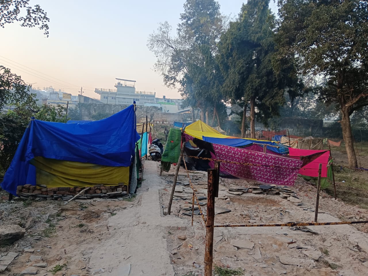 कड़कड़ाती ठंड में बेघर हुए रेलवे प्रभावितों को तिरपाल से राहत
