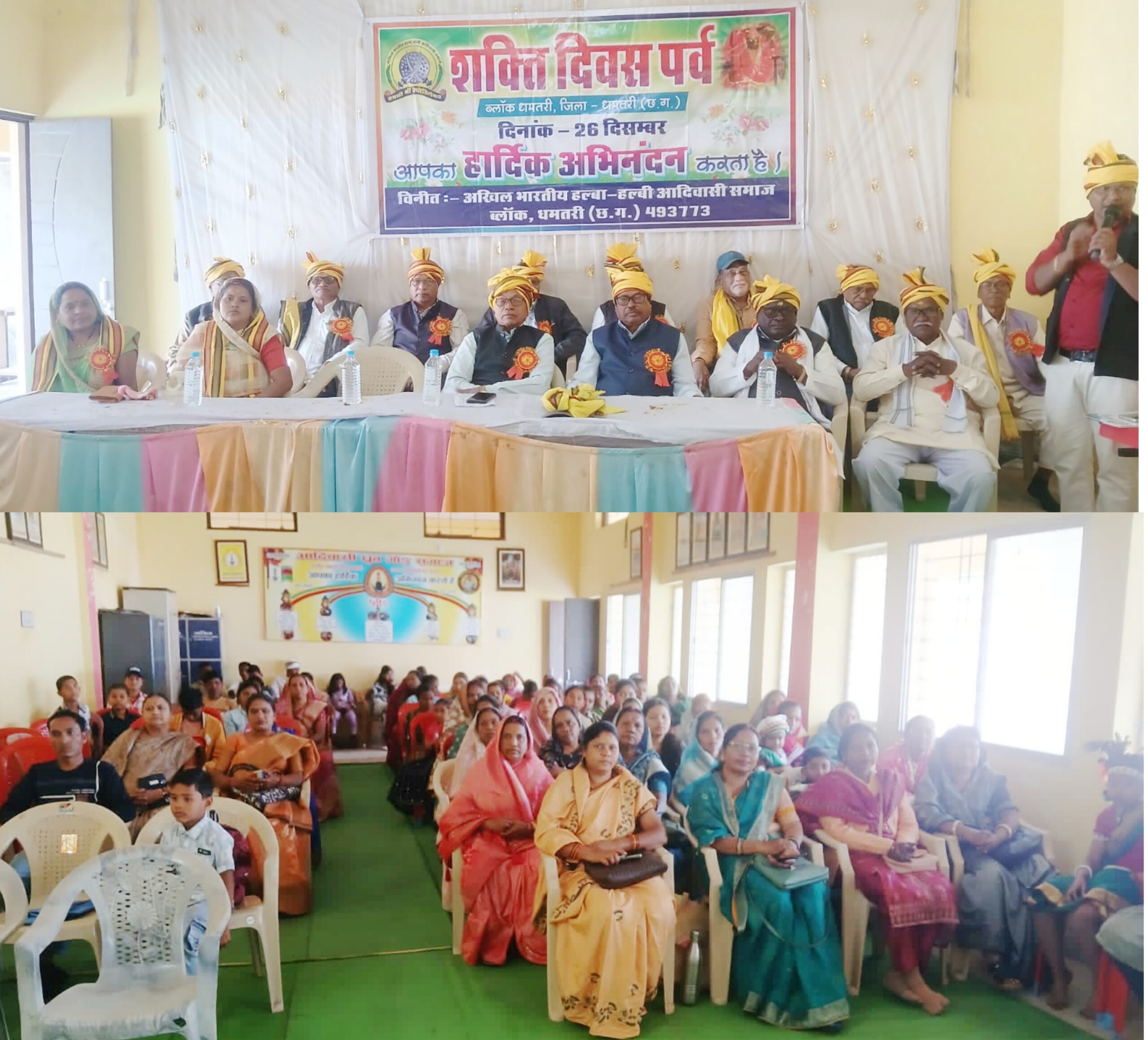 धमतरी।(प्रखर)आदिवासी हल्बा समाज द्वारा 26 दिसंबर को शक्ति दिवस का आयोजन गोंडवाना भवन, भिलाई माता में गरिमामय एवं उत्साहपूर्ण वातावरण में संपन्न हुआ। कार्यक्रम का शुभारंभ माँ दंतेश्वरी की आरती एवं शहीद गैंदसिंह की पूजा-अर्चना के साथ किया गया। इस अवसर पर समाज के वरिष्ठजन, युवा, महिलाएं एवं बच्चे बड़ी संख्या में उपस्थित रहे।