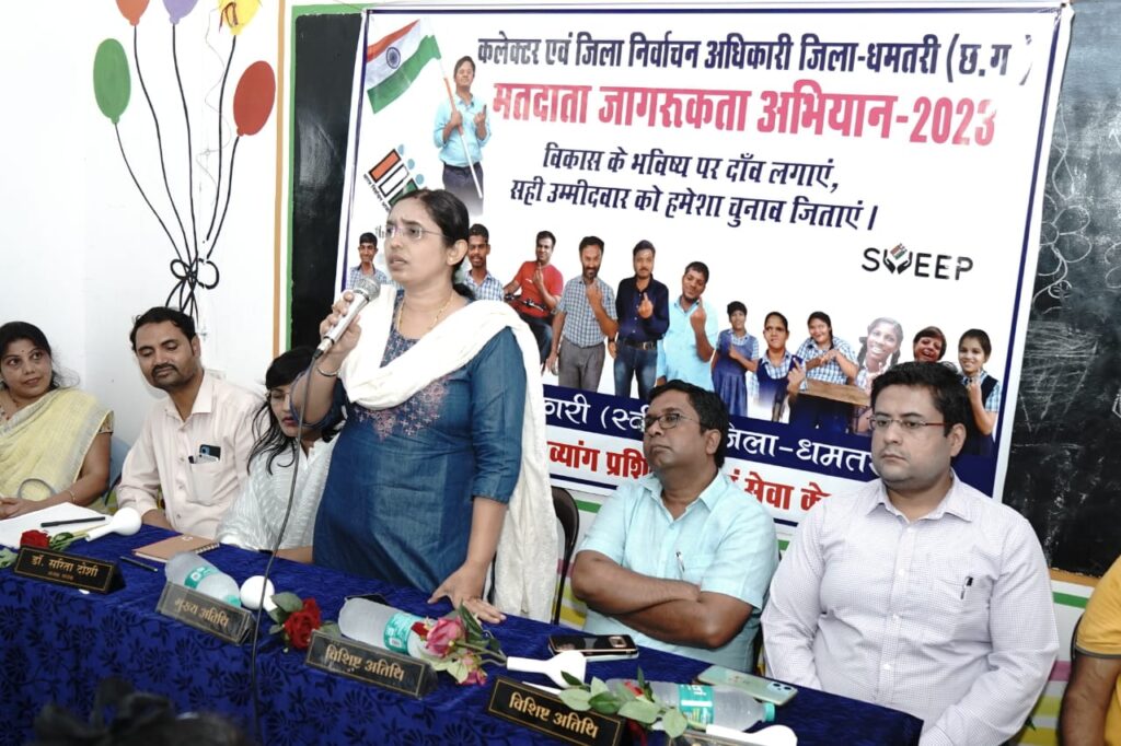 धमतरी 03 जुलाई 2023/ मतदाता जागरूकता अभियान के तहत् सार्थक स्कूल धमतरी में मतदान के महत्व पर जिले के दिव्यांग बच्चों एवं उनके परिजनों को आज जानकारी दी गयी। कलेक्टर एवं जिला निर्वाचन अधिकारी श्री ऋतुराज रघुवंशी के निर्देशानुसार मुख्य कार्यपालन अधिकारी जिला पंचायत एवं स्वीप जिला नोडल अधिकारी श्रीमती रोक्तिमा यादव ने दिव्यांग बच्चांे एवं उनके परिजनों को प्रदेश में आगामी विधानसभा चुनाव के मद्देनजर मतदान के बारे में बारिकी से जानकारी दी। उन्होंने कहा कि चुनाव में अपने मताधिकार का प्रयोग अवश्य करें और अपने आसपास के लोगों व परिजनों को भी मतदान के लिए प्रेरित करें। इसके साथ ही ऐसे मतदाता, जिनका नाम मतदाता सूची में नहीं जुड़ा है, वे पोर्टल पर ऑनलाईन आवेदन कर सूची में नाम जुड़वा सकते हैं। श्रीमती यादव ने दिव्यांग बच्चों के पालकों से कहा कि वे विभिन्न दिव्यांग संघों या लोगों से जुड़े होंगे। अतः ऐसे मतदाता जिन्हांेंने 18 वर्ष की आयु पूर्ण कर लिये है, उन्हें मतदान का महत्व बतायें और मतदान के लिए प्रोत्साहित करें। दिव्यांग बच्चे नई-नई गतिविधियां करने में उत्साह दिखाते हैं, अतः उन्हें स्वीप गतिविधियों से भी जोड़ें, ताकि उनसे अन्य लोग भी उनसे प्रेरित हो सकें।