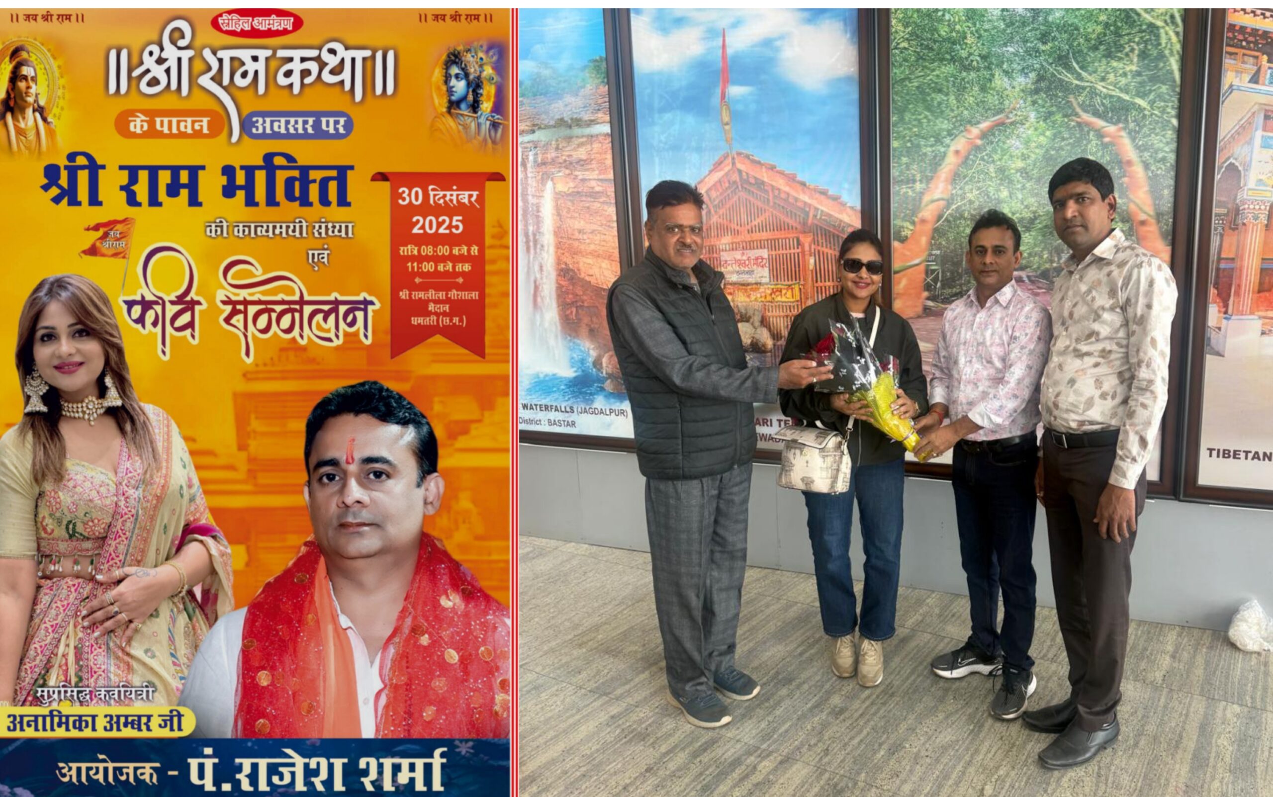 धमतरी (प्रखर) धार्मिक, सांस्कृतिक और साहित्यिक चेतना का अद्भुत संगम आज रात्रि धमतरी शहर के गौशाला मैदान में देखने को मिलेगा, जब देश की सुप्रसिद्ध एवं ख्यातिलब्ध कवयित्री अनामिका अंबर भगवान श्रीराम के जीवन चरित्र पर आधारित काव्यपाठ प्रस्तुत करेंगी। प्रतिष्ठा एकादशी के पावन अवसर पर आयोजित यह कार्यक्रम शहर के धार्मिक इतिहास में एक अविस्मरणीय और गौरवशाली अध्याय के रूप में दर्ज होने जा रहा है।
