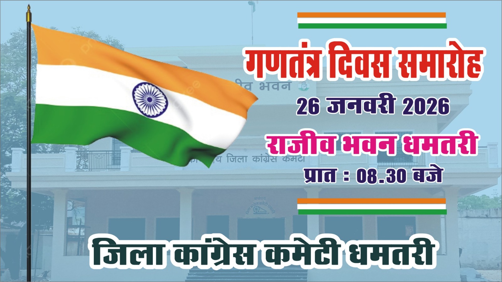 धमतरी। जिला कांग्रेस कमेटी धमतरी द्वारा प्रतिवर्ष की भांति इस वर्ष भी गणतंत्र दिवस का पावन पर्व कल 26 जनवरी 2025, सोमवार को हर्षोल्लास और गरिमामय वातावरण में मनाया जाएगा। इस अवसर पर प्रातः 08:30 बजे राजीव भवन, धमतरी में भव्य समारोह का आयोजन किया गया है।