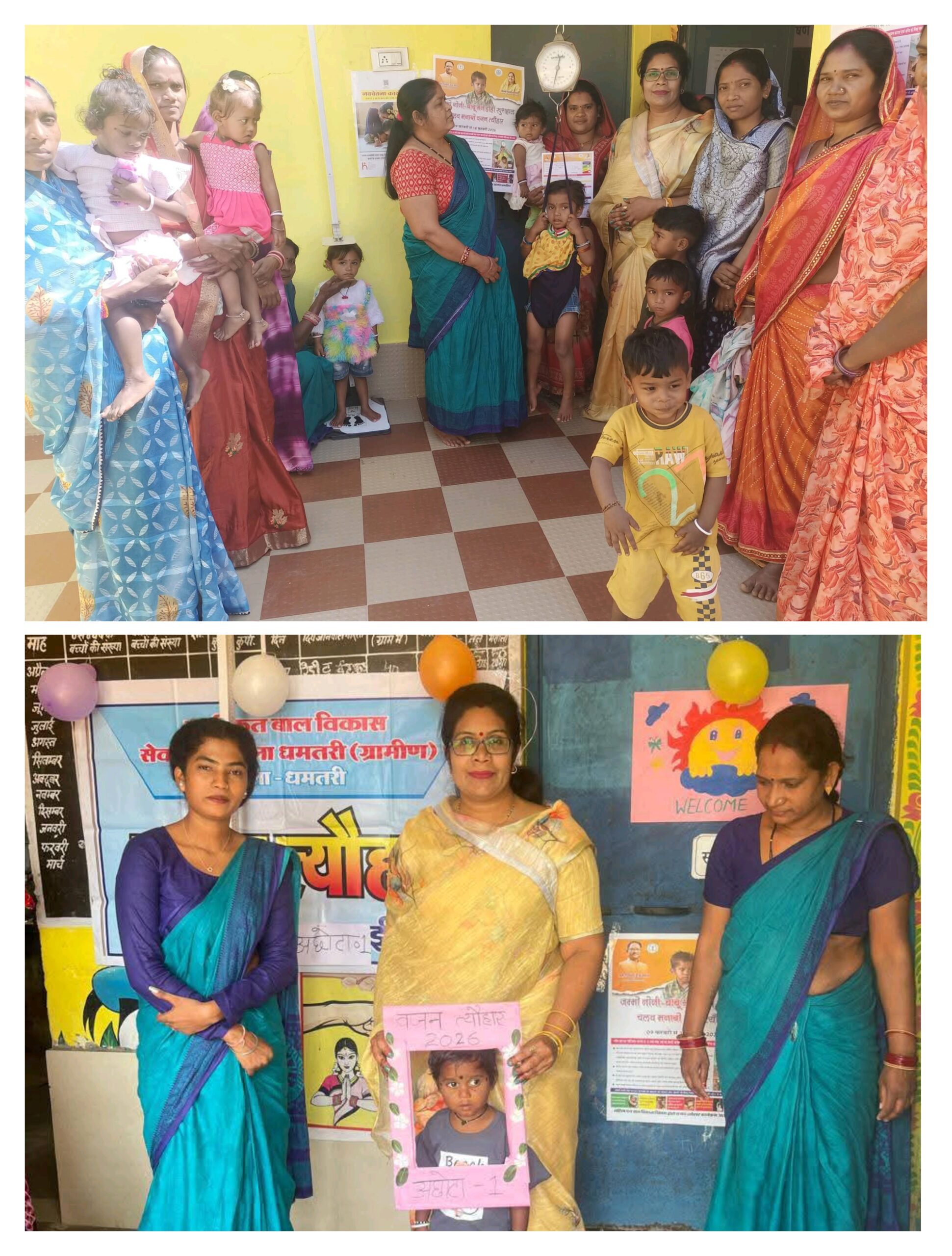 कार्यक्रम के दौरान आंगनबाड़ी केंद्रों में पंजीकृत बच्चों का नियमित रूप से वजन मापन कर उनके पोषण स्तर का मूल्यांकन किया गया। बच्चों के शारीरिक एवं मानसिक विकास को ध्यान में रखते हुए माताओं को संतुलित आहार, पौष्टिक भोजन, स्वच्छता एवं स्वास्थ्य संबंधी महत्वपूर्ण जानकारी दी गई। माताओं को बताया गया कि घर पर उपलब्ध स्थानीय खाद्य पदार्थों से भी बच्चों को भरपूर पोषण दिया जा सकता है।
