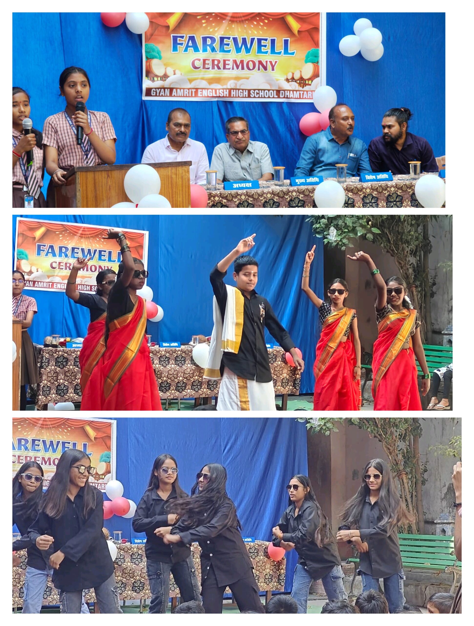 धमतरी। ज्ञान अमृत इंग्लिश हाईस्कूल में कक्षा 9वीं के छात्र-छात्राओं द्वारा कक्षा 10वीं के विद्यार्थियों तथा कक्षा 7वीं के छात्र-छात्राओं द्वारा कक्षा 8वीं के विद्यार्थियों के सम्मान में भावभीना विदाई समारोह आयोजित किया गया। कार्यक्रम में मुख्य अतिथि योगेश्वर साहू (सेवानिवृत्त व्याख्याता), विशिष्ट अतिथि रोहिताश मिश्रा (अध्यक्ष, किसान मोर्चा), कोमल सार्वा (पार्षद, ब्राह्मण पारा वार्ड) तथा अध्यक्षता विद्यालय के प्राचार्य विनोद कुमार पाण्डेय ने की।