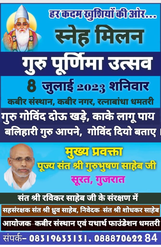 इस भावना को चरितार्थ करते हुए संत कबीर सेवा संस्थान एवं यथार्थ फाउंडेशन धमतरी के तत्वाधान में 8 जुलाई को कबीर नगर रत्नाबांधा, धमतरी में गुरु पूर्णिमा उत्सव मनाया जाएगा। जिसमें परम पूज्य संत श्री गुरुभूषण साहेब जी मुख्य प्रवक्ता के रूप में सूरत गुजरात से पधार रहे हैं साथ ही क्षेत्र के विभिन्न आश्रमों से संत गुरुजनों, साध्वीओ का आगमन होगा। कार्यक्रम संत श्री रविकर साहेब, अध्यक्ष छत्तीसगढ़ संत संगठन के संरक्षण में संपन्न होगा।