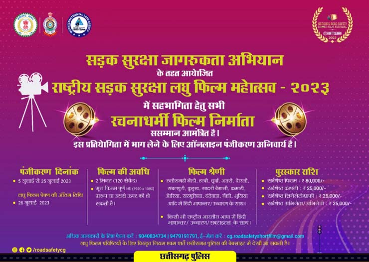 रायपुर। छत्तीसगढ़ पुलिस द्वारा सड़क सुरक्षा अभियान चलाया जा रहा है। इसके अंतर्गत अब लघु फिल्मों के जरिए भी जन जागरूकता के प्रयास किए जाएंगे। इसके लिए प्रदेश के रचनाधर्मी लोगों को सड़क सुरक्षा पर लघु फिल्म बनाने के लिए प्रेरित करते हुए राष्ट्रीय सड़क सुरक्षा लघु फिल्म महोत्सव 2023 के अंतर्गत प्रविष्टियां आमंत्रित की गई हैं।