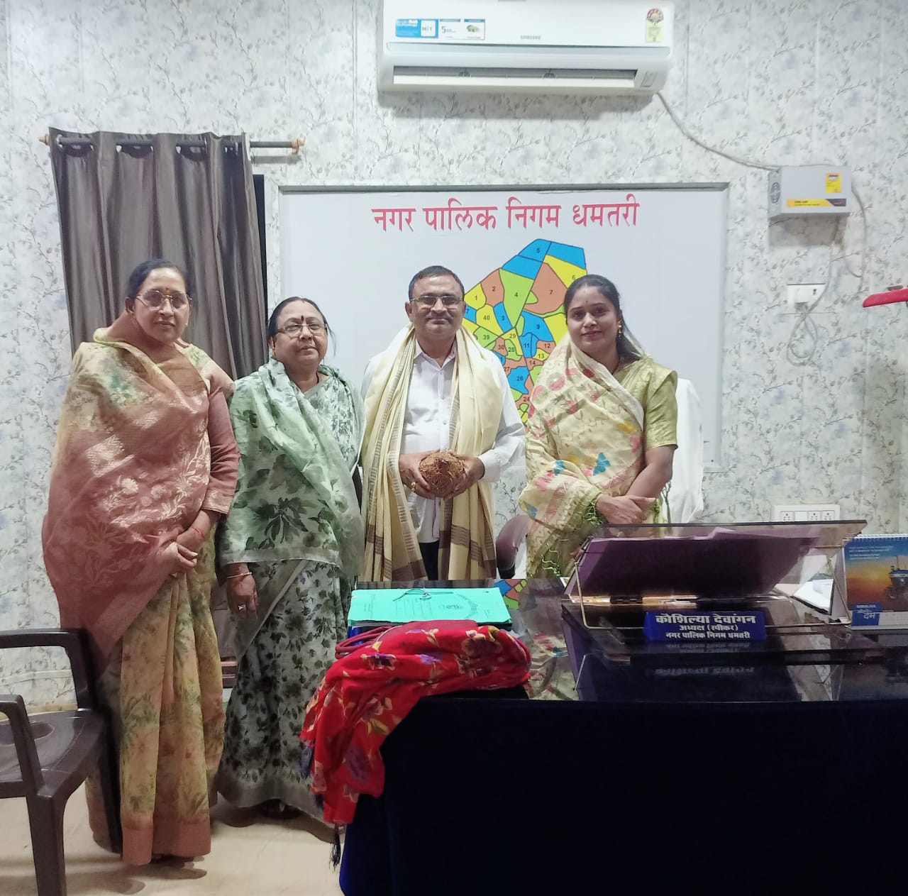धमतरी/ धोबी समाज के नवनिर्वाचित जिला अध्यक्ष मंगलू निर्मलकर ने नगर निगम सभापति श्रीमती कौशिल्या देवांगन से सौजन्य मुलाकात की। इस अवसर पर पार्षद चंद्रभागा साहू एवं पूर्व नगर पालिका उपाध्यक्ष चित्ररेखा निर्मलकर भी उपस्थित रहीं।