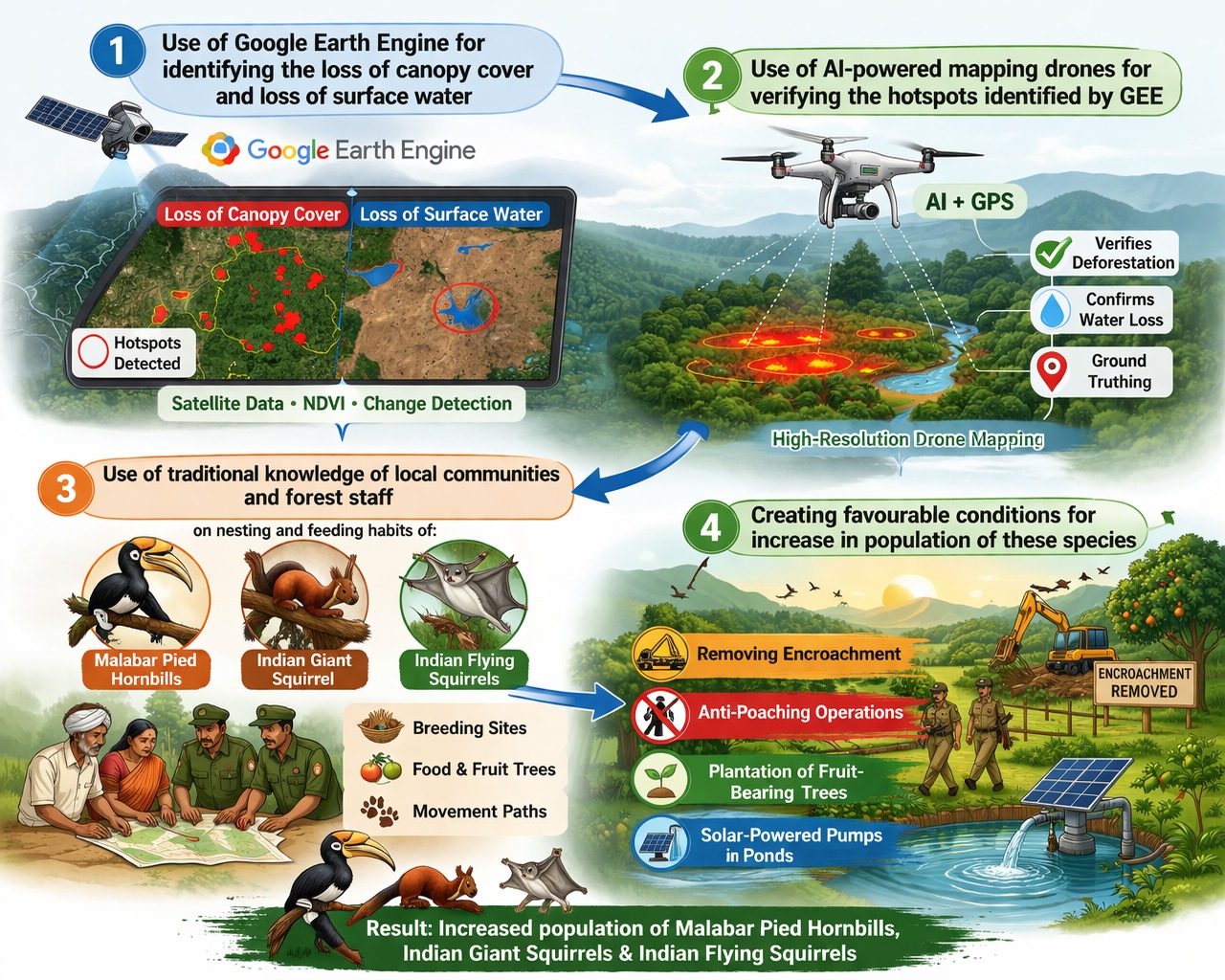 हॉटस्पॉट क्षेत्रों का ड्रोन के जरिए सर्वेक्षण कर वास्तविक स्थिति का आकलन किया गया। इससे संरक्षण के लिए प्राथमिकता वाले क्षेत्रों का सटीक चयन संभव हुआ।