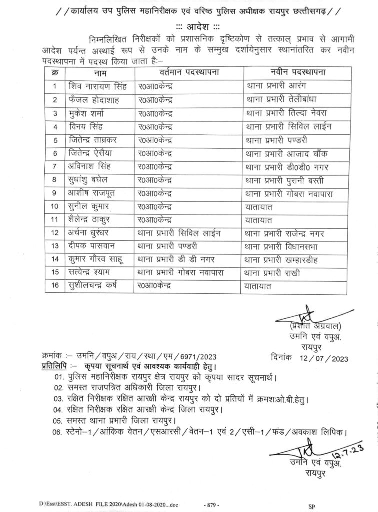 जारी आदेश के मुताबिक थाना प्रभारी फैजल होदाशाह को तेलीबांधा थाने की जिम्मेदारी दी गई है। वहीं गौरव साहू को खम्हारडीह, शिव नारायण सिंह को आरंग, मुकेश शर्मा को तिल्दा नेवरा, विनय सिंह- सिविल लाइन, जितेंद्र ताम्रकार को पंडरी, जितेंद्र एसैया को आजाद चौक, अविनाश सिंह को डीडी नगर, सुधांशु बघेल को पुरानी बस्ती, आशीष राजपूत को गोबरा नवापारा, अर्चना धुरंधर को राजेंद्र नगर, दीपक पासवान को विधानसभा, सत्यम श्याम को थाना प्रभारी राखी की जिम्मेदारी दी गई है।