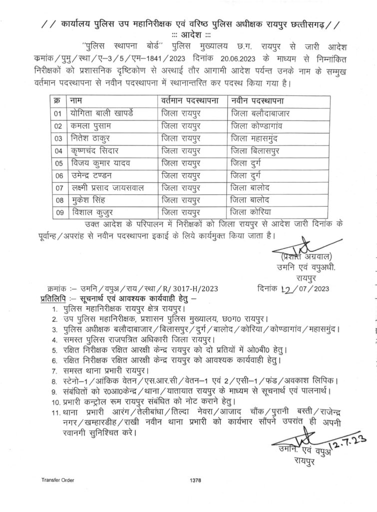 साथ ही रायपुर जिले में पदस्थ निरीक्षक योगिता खापर्डे को बलौदाबाजार, कमला पुसाम को कोंडागांव, नितेश ठाकुर को महासमुंद, कृष्णचंद सिदार को बिलासपुर, विजय कुमार यादव को दुर्ग, उमेन्द्र टंडन को दुर्ग, लक्ष्मी प्रसाद जायसवाल को बालोद, मुकेश सिंह को बालोद और विशाल कुजूर को कोरिया में पदस्थापना मिली है।