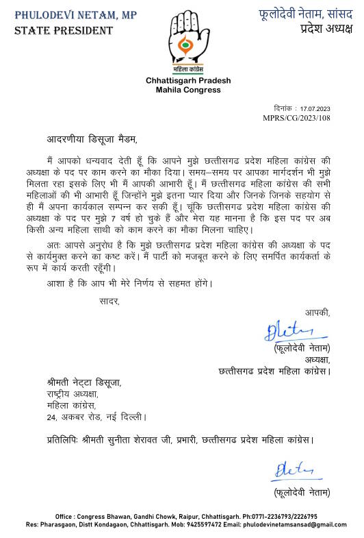 रायपुर। प्रदेश की राजनीती से एक बड़ी खबर सामने आई है। छत्तीसगढ़ प्रदेश महिला कांग्रेस अध्यक्ष के पद से सांसद फूलोदेवी नेताम ने इस्तीफा दे दिया है। उन्होंने महिला कांग्रेस की राष्ट्रीय अध्यक्षा नेट्टा डिसूजा को इस्तीफा भेजा है। फूलोदेवी नेताम ने अपने पत्र में किसी अन्य महिला साथी को काम करने का मौका दिए जाने की बात कही है।