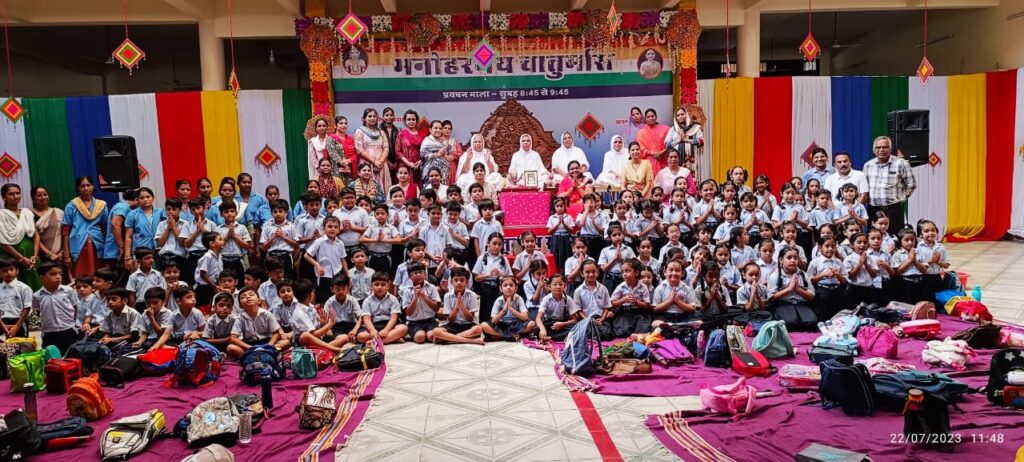 आज वर्धमान नगर स्थित राजेंद्रनगर के विचक्षण जैन विद्यापीठ के 120 बच्चे धर्मनाथ जिनालय दादाबाड़ी पहुंचे। मनोहरमय चातुर्मास समिति के अध्यक्ष सुशील कोचर और महासचिव नवीन भंसाली ने बताया कि साध्वी वृंद के दर्शन वंदन के लिए आज यह बच्चे दादाबाड़ी पहुंचे। मनोहरमय चातुर्मास समिति और श्री ऋषभदेव मंदिर ट्रस्ट के द्वारा उनका अभूतपूर्व अभिनंदन कर भोजन व्यवस्था प्रदान की गई। साथ ही शानदार उपहार पाकर बच्चो के चेहरे खिल उठे।