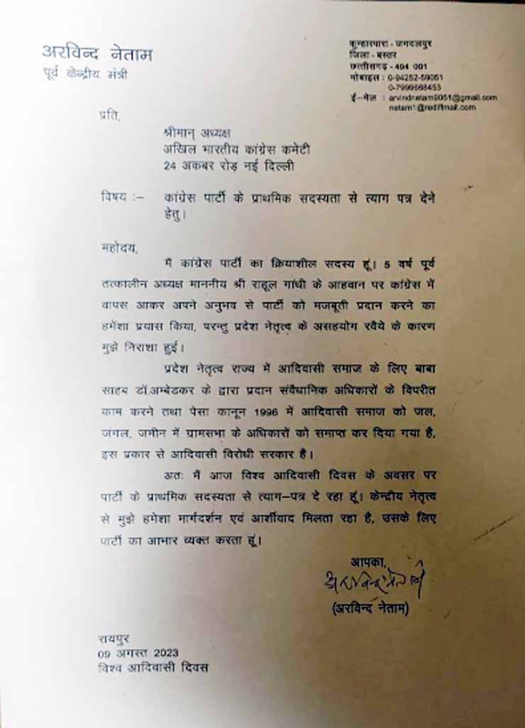 रायपुर। कांग्रेस के वरिष्ठ आदिवासी नेता अरविंद नेताम ने एआईसीसी और प्रदेश कांग्रेस अध्यक्ष को अपना इस्तीफा भेजा है। नेताम सर्व आदिवासी समाज के संरक्षक हैं। अरविंद नेताम ने अपने पत्र में लिखा, मैं कांग्रेस पार्टी का क्रियाशील सदस्य हूं। 5 वर्ष पूर्व तत्कालीन अध्यक्ष राहुल गांधी के आह्वान पर कांग्रेस में वापस आकर अपने अनुभव से पार्टी को मजबूती प्रदान करने का हमेशा प्रयास किया, लेकिन प्रदेश नेतृत्व के असहयोग रवैये के कारण मुझे निराशा हुई। प्रदेश नेतृत्व राज्य में आदिवासी समाज के लिए बाबा साहब डॉ. अम्बेडकर के द्वारा प्रदान संवैधानिक अधिकारों के विपरीत काम करने तथा पेसा कानून 1996 में आदिवासी समाज को जल, जंगल, जमीन में ग्रामसभा के अधिकारों को समाप्त कर दिया गया है। इस प्रकार से आदिवासी विरोधी सरकार है। अतः मैं आज विश्व आदिवासी दिवस के अवसर पर पार्टी के प्राथमिक सदस्यता से त्याग पत्र दे रहा हूं। केन्द्रीय नेतृत्व से मुझे हमेशा मार्गदर्शन एवं आर्शीवाद मिलता रहा है, उसके लिए पार्टी का आभार व्यक्त करता हूं।