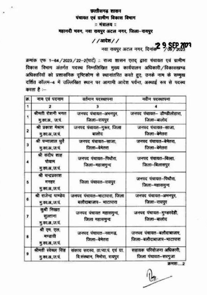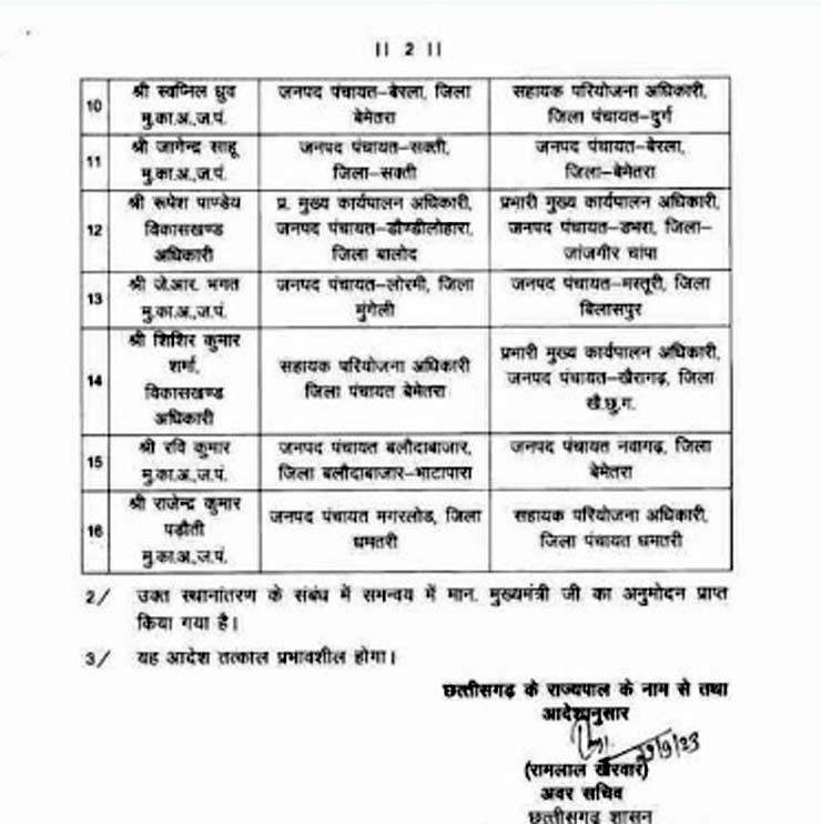 छग : मुख्य कार्यपालन अधिकारी व विकासखंड अधिकारियों का तबादला, आदेश जारी