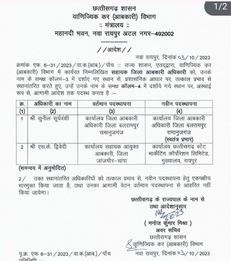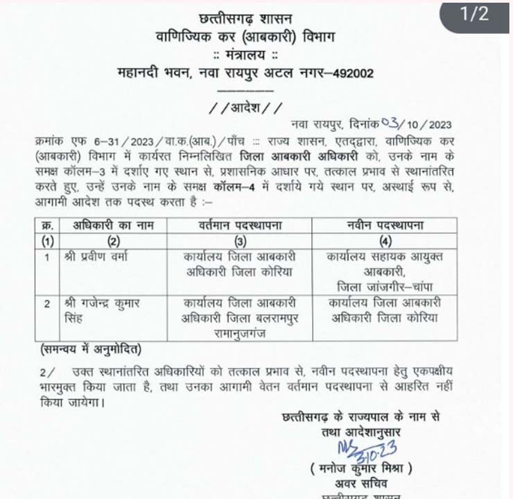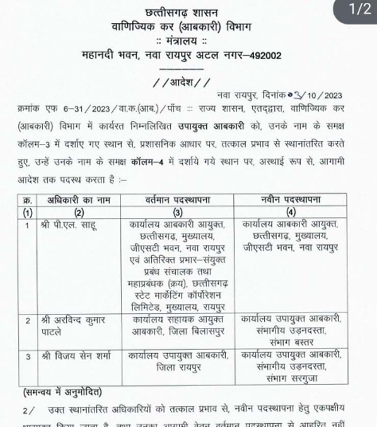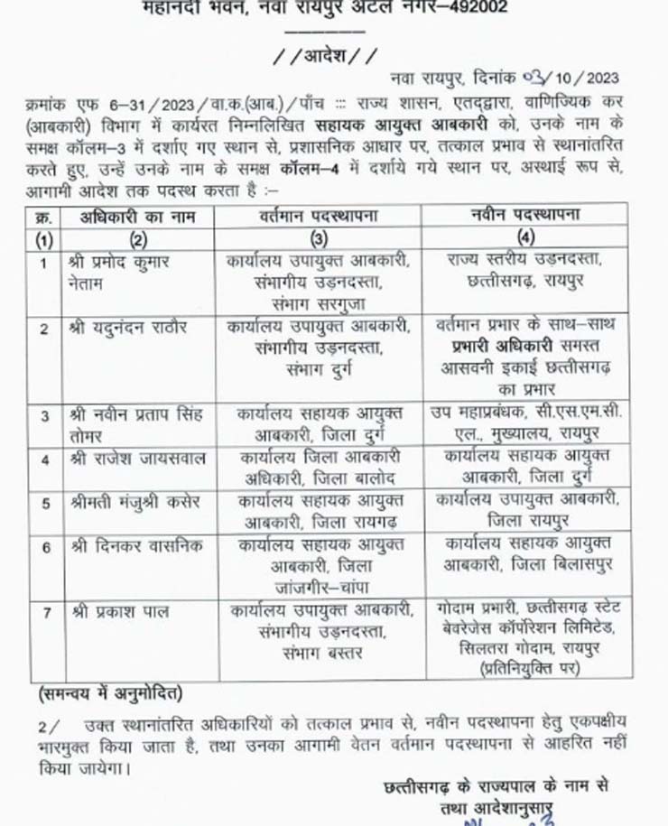छत्तीसगढ़ : आबकारी विभाग में तबादला, सहायक जिला आबकारी अधिकारी और सहायक आयुक्त के तबादले
