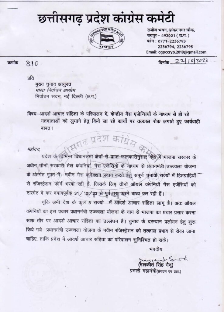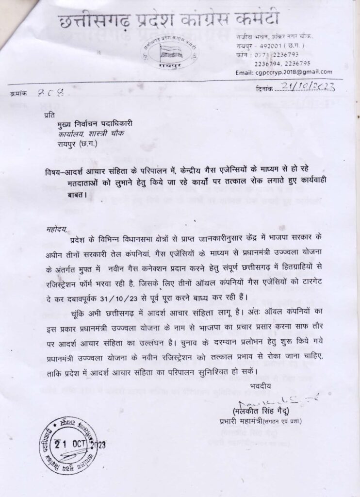 रायपुर। छत्तीसगढ़ प्रदेश कांग्रेस ने विज्ञप्ति जारी कर कहा कि प्रदेश के विधानसभा क्षेत्रों से प्राप्त जानकारीनुसार केंद्र में भाजपा सरकार के अधीन तीनों सरकारी तेल कंपनियां, गैस एजेंसियों के माध्यम से प्रधानमंत्री उज्ज्वला योजना के अंतर्गत मुफ्त में नवीन गैस कनेक्शन प्रदान करने हेतु संपूर्ण चुनावी राज्यों में हितग्राहियों से रजिस्ट्रेशन फॉर्म भरवा रही है, जिसके लिये तीनों ऑयल कंपनियों गैस एजेंसियों को टारगेट दे कर दबावपूर्वक 31/10/2023 से पूर्व पूरा करने बाध्य कर रही है।