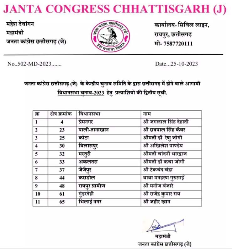 जनता कांग्रेस ने जारी की दूसरी सूची, रेनू जोगी और ऋचा जोगी लड़ेंगी चुनाव