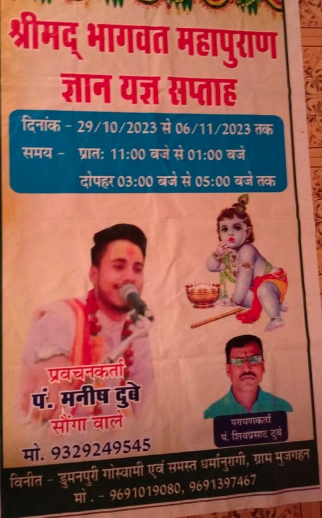 धमतरी – राधे रानी श्री बांके बिहारी तथा आदिशक्ति बम भोले बाबा की कृपा से एवं पूर्वजों के आशीर्वाद से हमारे ग्राम मुजगहन में श्रीमद् भागवत महापुराण ज्ञान यज्ञ सप्ताह का आयोजन गोस्वामी परिवार द्वारा किया जा रहा हे। आयोजन 29 अक्टूबर से 6 नवंबर तक आयोजित हे। जिसमें प्रवचन करता पंडित मनीष दुबे सौंगा वाले,पारायण करता पंडित शिवप्रसाद दुबे वही यह आयोजन का शुरू होने का समय 1 बजे से 5 बजे विराम।इसके आयोजन करता श्रीमती कथा गोस्वामी,श्रीमती आद्धिका गोस्वामी, डुमन पुरी गोस्वामी एवं समस्त गोस्वामी परिवार द्वारा ग्राम मुजगहन में आयोजित किया गया है।