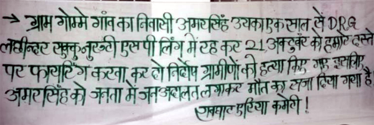 जानकारी के अनुसार, नक्सलियों ने ग्राम गोमे में जनअदालत लगाकर हत्या करने की बात कही है। मृत युवक का नाम अमर सिंह उइका बताया जा रहा है। नक्सलियों ने घटनास्थल पर बैनर भी फेंका है। युवक अमर सिंह पर डीआरजी के लिए मुखबिरी कर दो ग्रामीणों की हत्या करने का नक्सलियों ने आरोप लगाया है। इस घटना की जिम्मेदारी रावघाट एरिया कमेटी ने ली है। वहीं इस मामले में पुलिस अधीक्षक दिव्यांग पटेल ने मीडिया को कहा है कि घटना की जानकारी मिली है और मामले की जांच की जा रही है।