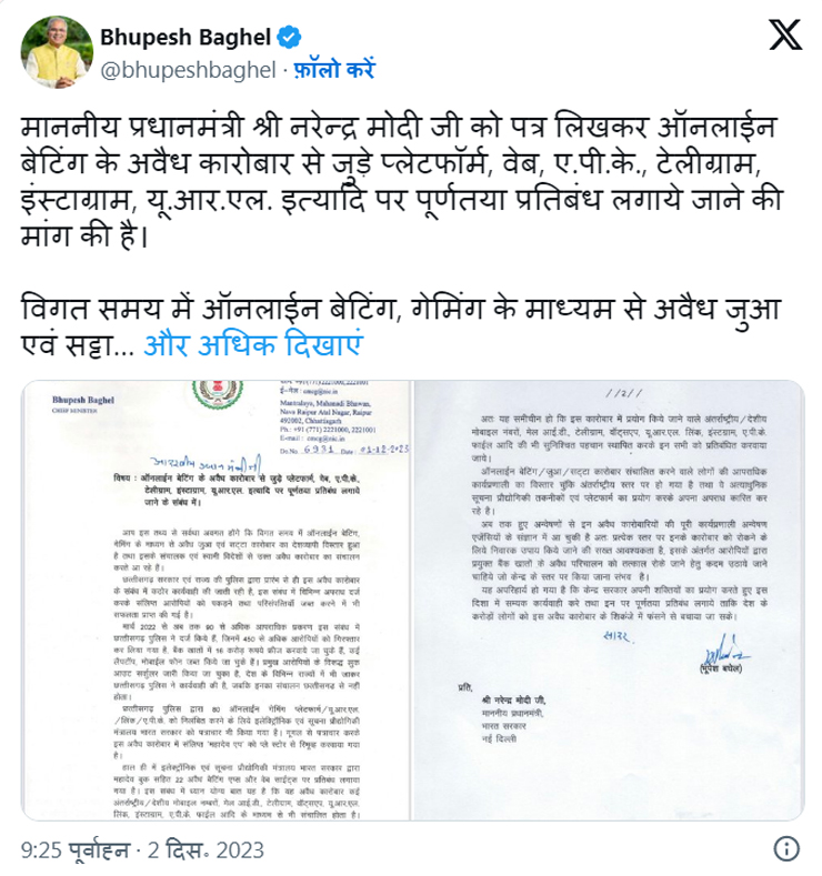 सीएम भूपेश बघेल ने अपने ट्विटर अकाउंट पर ट्वीट कर लिखा है कि प्रधानमंत्री नरेंद्र मोदी को पत्र लिखकर ऑनलाइन बेटिंग के अवैध कारोबार से जुड़े प्लेटफॉर्म, वेब, ए.पी.के., टेलीग्राम, इंस्टाग्राम, यू.आर.एल. इत्यादि पर पूर्णतया प्रतिबंध लगाये जाने की मांग की है। विगत समय में ऑनलाईन बेटिंग, गेमिंग के माध्यम से अवैध जुआ एवं सट्टा कारोबार का देशव्यापी विस्तार हुआ है तथा इसके संचालक एवं स्वामी विदेशों से उक्त अवैध कारोबार का संचालन करते आ रहे हैं।