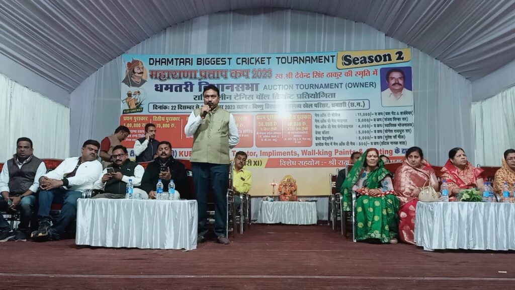 जिसका भव्य शुभारंभ 22 दिसम्बर दिन शुक्रवार को हुआ जिसके मुख्य अतिथि धमतरी नगर निगम के महापौर विजय देवांगन ,राजपूत क्षत्रिय महासभा के अध्यक्ष श्रीमती पुष्पा देवी ठाकुर,राजेश ठाकुर ,आलोक जाधव,आकाश गोलछा,सलज अग्रवाल,कमलेश सोनकर,दीपक सोनकर,मोहन साहू,रेखा ठाकुर,मीना ठाकुर,माधवी ठाकुर,रागनी ठाकुर सहीत उपस्थित लोगों के द्वारा भगवान श्री गणेश जी की पूजा अर्चना कर ग्राउंड में रिबन काटकर व दोनो टीमो के मध्य टॉस करवाकर मैच का शुभारंभ किया।