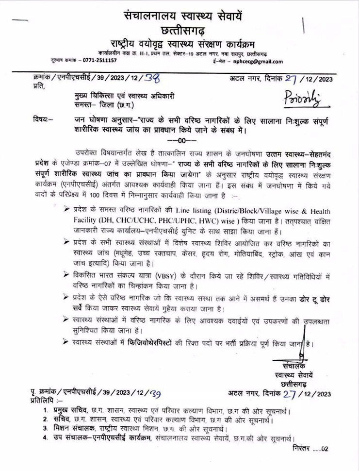 रायपुर। छत्तीसगढ़ में अब वरिष्ठ नागरिकों को निःशुल्क सम्पूर्ण शारीरिक स्वास्थ्य जांच की सुविधा मिलेगी। संचालनालय स्वास्थ्य सेवाए छत्तीसगढ़ द्वारा इस संबंध में प्रदेश के सभी मुख्य चिकित्सा एवं स्वास्थ्य अधिकारियों आदेश पत्र जारी किया है, जिसमें राज्य के सभी वरिष्ठ नागरिकों के लिए सालाना निःशुल्क संपूर्ण शारीरिक स्वास्थ्य जांच की सुविधा शुरू करने के लिए आवश्यक निर्देश दिए गए है।