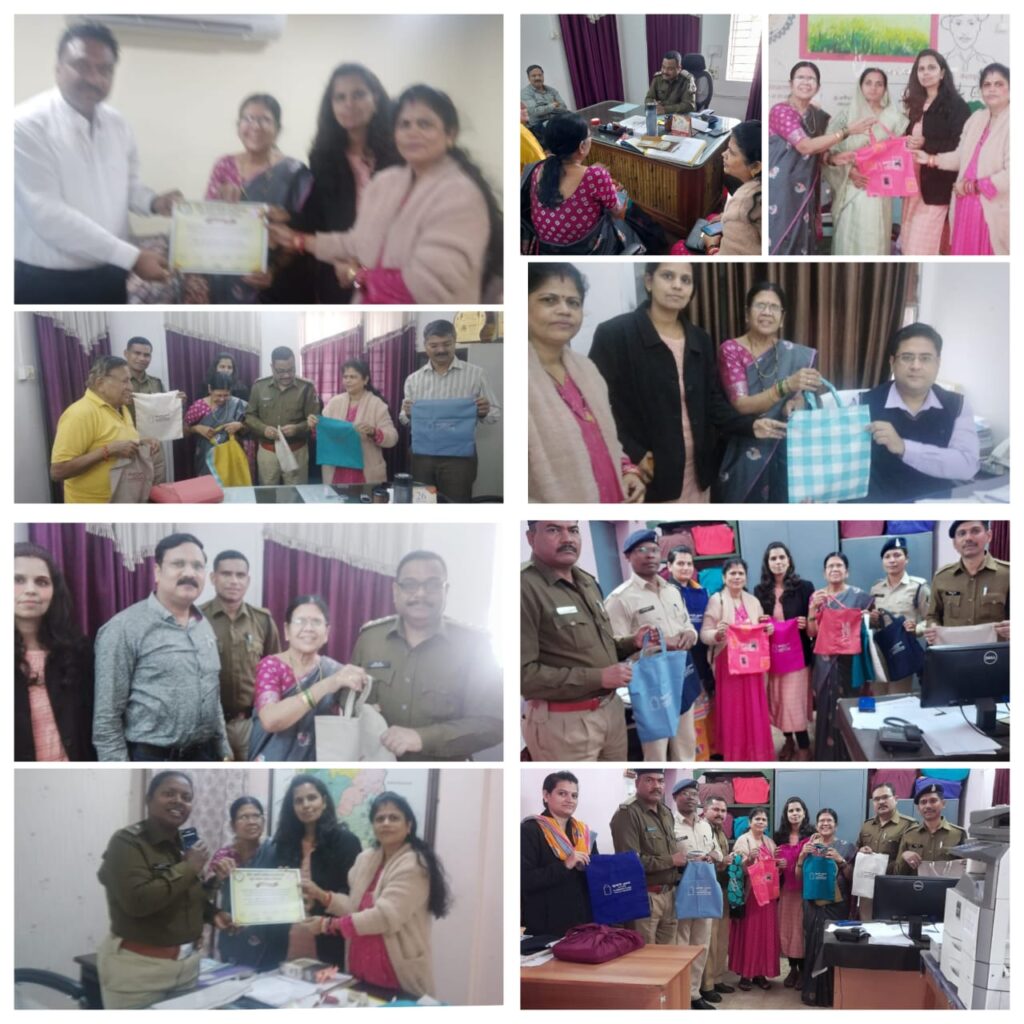 पुलिस विभाग में अतिरिक्त पुलिस अधीक्षक मधुलिका सिंह ,डीएसपी भावेश राव के साथ स्टॉफ को भी नई कपड़े की थैलियां दी गई एवम् उन्हें ब्रेल लिपि की किताबे भी दिखाई, जिसमे हनुमान चालीसा विशेष है जिसे सभी ने ध्यान से देखा और प्रसंशा भी की ।